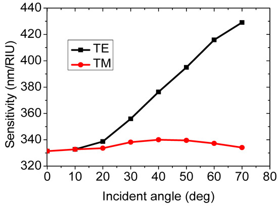 Sensitivity versus incident angle for both TE and TM modes at hf = 500 nm.