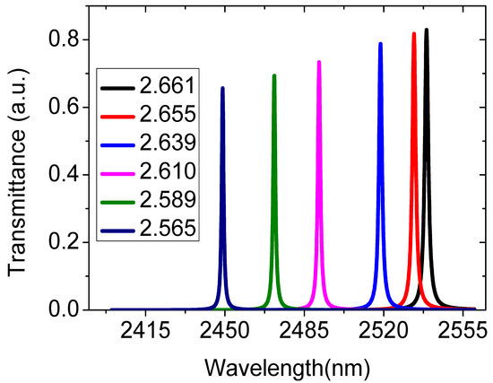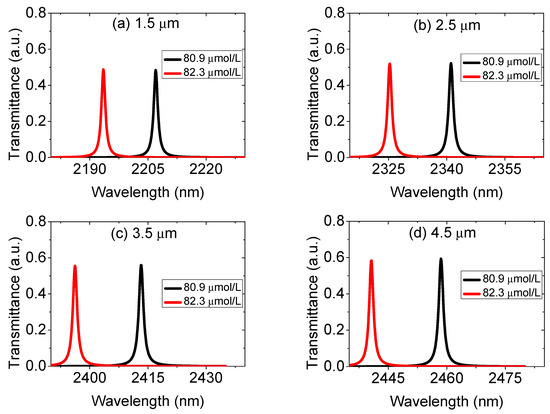 Transmittance curves of the suggested TPC biosensor with different thicknesses of cavity layers: (a) 1.55 µm, (b) 2.55 µm, (c) 3.55 µm, and (d) 4.5 µm at θ0 = 0°.