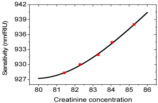 Equation (8) can be employed to predict the resonant position of the peak for any concentration of creatinine. Table 5 shows the numerically calculated positions of the resonant peak, shift of wavelength, and sensitivity of creatinine biosensor. This table presents the sensitivity variation of the suggested structure between 928.33 nm/RIU and 938.02 nm/RIU under the effect of various concentrations of creatinine. Moreover, the polynomial relation between the sensitivity (S) of our biophotonic sensor and the concentration of creatinine in the blood (C) of the suggested TPC biosensor can be fitted and expressed as
