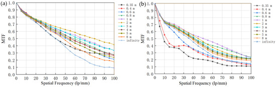 There are a large number of cone cells near the fovea of the retina, which allow us to distinguish details [27]. However, the cone density declines sharply with the increasing eccentricity of the fovea and drops by an order of magnitude at a distance of 1 mm from the foveal center (corresponding to 4° FOV) [28]. Therefore, the MTF curves of the pseudophakic eye model in a 4° FOV have been analyzed additionally at 10 object locations. The results are shown in Figure 4. The MTF values under photopic vision shown in Figure 4a are greater than 0.27 at 50 lp/mm and remain above 0.09 at 100 lp/mm for object distances ranging from 0.35 m to infinity. Figure 4b shows the MTFs of the eye model under a 4.5 mm pupil (mesopic vision). The MTF values are higher than 0.21 at 50 lp/mm and remain above 0.11 at 100 lp/mm for object distances ranging from 0.35 m to infinity. Only a slight decline in MTF at a 4° FOV is observed in comparison with that at 0° FOV. The results show that the designed IOL implanted in the eye model has quite good optical performance in both photopic vision and mesopic vision for 4° FOV.