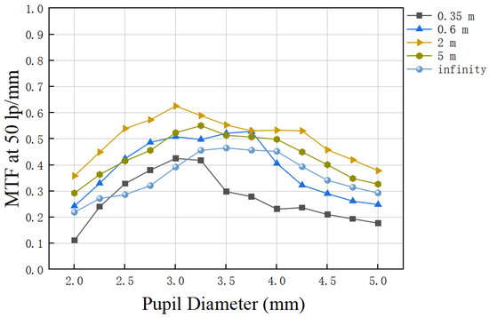 MTF at 50 lp/mm as a function of pupil diameter of the pseudophakic eye model for five object locations of 0.35, 0.6, 2, 5 m, and infinity.