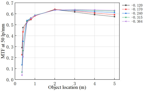 Corneal spherical aberration varies from individual to individual [29]. An ideal IOL should work well under different corneal spherical aberrations. Therefore, MTF at 50 lp/mm of the pseudophakic eye model with five different corneal spherical aberrations was analyzed at 0° FOV under 3 mm pupil diameter [18]. Here, we simulate different corneal spherical aberrations by setting different corneal aspheric coefficients, −0.120, −0.170, −0.240, −0.315, and −0.364 corneal aspherical coefficients correspond to corneal spherical aberrations of 0.42, 0.36, 0.27, 0.18, and 0.12 μm under a pupil diameter of 6 mm respectively, which can cover 90% of the population [30,31]. The results are shown in Figure 6. The MTFs at 50 lp/mm are affected slightly by the corneal spherical aberration only for near object distances of 0.35 m and 0.4 m. For large object distances, the corneal spherical aberration plays little role in the MTFs at 50 lp/mm.
