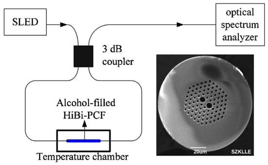 Experimental setup for a temperature sensor based on an FLM. Inset: SEM of the used HiBi-PCF [reprinted with permission from [49] © The Optical Society].