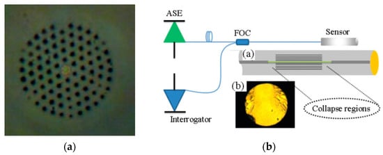 (a) cross-section of the microstructure fiber and (b) experimental setup with collapsed region of the microstructure fiber and gold coated at the one end of the single-mode fiber [61].
