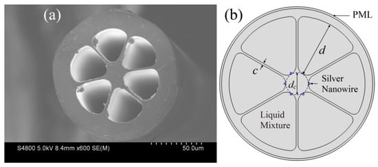 (a) Cross-section of the six-hole PCF; (b) schematic of the proposed sensing device coated with silver nano wires and filled with the mixture of ethanol and chloroform [62].