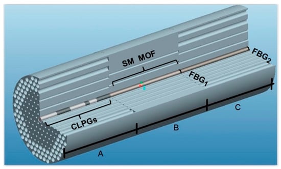 A sensing device with improved sensitivity based on the MOF and worked on the surface plasmon resonance principle was further demonstrated by the same group in 2014 [63]. The MOF’s air holes are coated with silver metal and filled with a mixture of ethanol and chloroform which have a very high thermo-optic coefficient. The usage of all six fiber openings, as well as their relatively large size, should make silver coating and liquid mixture filling easier. Temperature fluctuations will cause changes in the coupling efficiency between the core-guided mode and the plasmonic mode, resulting in various loss spectra being recorded. The liquid mixture’s refractive index is near to that of the MOF material, which improves coupling efficiency and sensitivity. Numerical results depict a temperature sensitivity of 5.6 nm/K and that the most sensitive range of the sensor can be modified by varying the volume ratios of ethanol and chloroform. Apart from these structures, different temperature-sensing devices with a different configurations of the MOF are demonstrated [64,65,66,67]. In 2015, Scarcia et al. proposed an accurate theoretical analysis of the viability of a unique fiber-optic temperature sensor designed as a standalone device [68]. The sensor is built on a trio of integrated/spliced microstructured optical fibers (MOFs). The first incorporates an appropriate cascade of LPGs into the core. The other two sensor parts are a single-mode intermediate MOF and a ytterbium-doped MOF laser. The three MOFs are made to be readily spliced together, as shown in Figure 5. The entire design is carried out using ad hoc computer code created specifically for this purpose. A low-cost pump diode laser at 980 nm wavelength and a commercial optical power detector are all that is required for a comprehensive temperature-monitoring setup. The simulated sensitivity S = 315.1 µW/°C and operation range ΔT = 100 °C are adequate for real-world applications [68]. In 2015, two all-fiber loop mirrors employing a clover microstructured fiber for simultaneous temperature and strain monitoring are demonstrated [69]. The design of the fiber allowed for the observation of various interferences caused by the microstructured fiber core section. Different sensitivities to temperature and strain were obtained, and both physical characteristics may be discriminated using a matrix technique. For temperature and strain, resolutions of ±2 °C and ±11 με for the first structure and ±2.3 °C and ±18 με for the second were obtained.