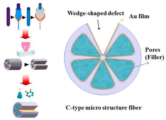 Using the optimal polymer optical fiber for Bragg grating sensing, fabrication, and analysis of an infinitely single-mode microstructured polymer optical fiber is presented in [80]. This fiber is constructed of cyclo-olefin homopolymer Zeonex grade 480R, which showed a very high glass transition temperature of 138 °C and was not observed to be affected by humidity. The temperature sensitivity of this fiber was obtained of 24.01 ± 0.1 pm/°C for both increasing and decreasing temperatures. Apart from these sensing devices for temperature measurement, many researchers used MOFs for the simultaneous measurements of two or more physical parameters [81,82,83]. In 2018, Korganbayev et al. demonstrated a linearly chirped Bragg grating fiber engraved in a microstructured polymer optical fiber for temperature detection during thermal treatments [84]. A KrF laser and uniform phase mask were used to inscribe a CFBG of 10 mm length and 0.98 nm bandwidth in an mPOF fiber. The temperature sensitivity of the CFBG was reported to be 191.4 pm/°C. A novel sensing approach based on a C-type microstructured fiber for simultaneous monitoring of seawater temperature and salinity was presented by Zhao et al. [85]. The C-type fiber structure, as shown in Figure 6, was created by removing the outer wall of one pore from a six-hole microstructured fiber, enabling birefringence to enter and breaking the original pattern of degeneracy. Furthermore, a gold layer was applied to the structure’s surface to improve sensing sensitivity using the SPR phenomena. Model studies demonstrated that the suggested filling structure might generate two SPR loss valleys with distinct sensitivity to temperature and salinity. Maximum temperature sensitivity of 7.609 nm/°C was obtained for Y polarization, demonstrating that the designed scheme could not only solve the cross-sensitivity problem of two parameters but also achieve high sensitivity.