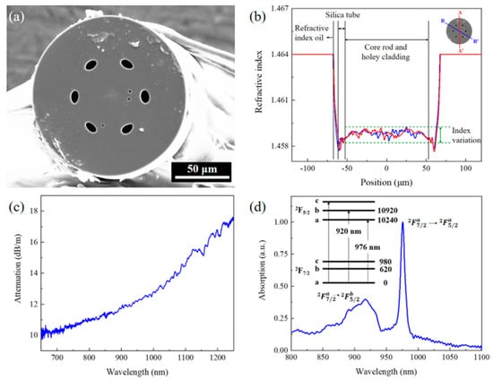 (a) SEM image of the Yb−doped silica microstructured optical fiber; (b) the refractive index profile of the fabricated Yb−doped silica microstructured optical fiber along different directions, (c) variation of attenuation of the fiber with different wavelengths, and (d) the absorption spectrum of the fiber [95].