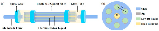 - Liu, Y.; Liu, X.; Ma, C.; Zhou, Y. Micro-structured optical fiber sensor for simultaneous measurement of temperature and refractive index. Opt. Fiber Technol. 2018, 41, 168–172. [Google Scholar] [CrossRef]