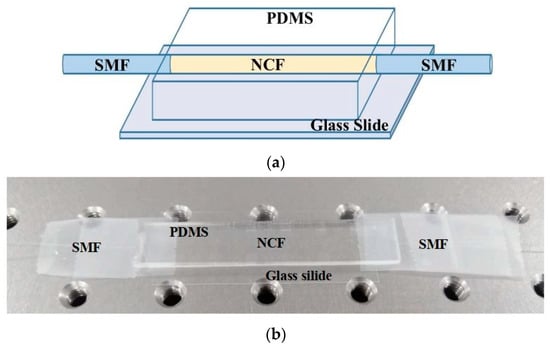 Wang et al. presented a temperature sensor with an SMF–NCF–SMF structure with PDMS coating [18]. In this work, PDMS due to its negative thermos-optic coefficient and large thermal expansion coefficient (TEC) was employed to increase the TEC of no-core optical fiber to finally enhance the temperature sensitivity of the proposed sensor. The study reports the result obtained using both theoretical analysis (MATLAB) and experiment. The schematic and physical diagram of the sensor is shown in Figure 11.