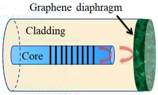 In 2018, Dong et al. reported the utilization of graphene oxide (GO) as a sensing layer integrated over FBG for simultaneous pressure and temperature monitoring [126]. The sensing configuration was based on the Fabry–Perot interferometer (FPI). The light reflectors of the fabricated FPI sensor comprise a thin graphene film coated over the end facet of FBG, as shown in Figure 12. The sensor exhibited good sensitivities of 501.4 nm/kPa and 306.2 nm/°C, for pressure and temperature, respectively. The introduction of FBG along with GO can successfully prevent the cross-impact of the FPI sensor. Following the improvement of sensing performance, in the same year of 2018, Jasmi et al. also reported an FBG-based temperature sensor by utilizing polyurethane-GO nanocomposite as a sensing layer [127]. The physical, chemical, and conductivity of PU-GO were observed to be improved after introducing GO in the pristine PU. The thermogravimetric analysis exhibited that the thermal stability of PU improved to 217 °C because of the strong intermolecular interaction with graphene flakes leading to an enhanced in sensing performance. The sensing material was coated over FBG using dip-coating to obtain uniform thickness, while the sensing performance of the device was evaluated for a wide range of temperatures varying from 25 to 60 °C. The sensor exhibited good linearity along with an improved sensitivity of 6 pm/°C.
