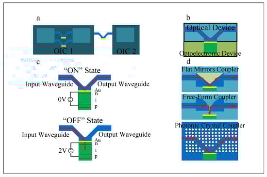 Several schematic designs and applications are shown for the surface optical connections to electronic circuits of integrated chips in Figure 1a, including the coupling of two internal parts of an optical integrated circuit (OIC) and the linking of two segregated OICs. One of the candidate technologies for these connections is silicon photonics (SiP), which uses CMOS processes to connect electronic chips through multi-level integration [,]. Recently, a seamless hybrid-integrated interconnected network architecture has been proposed that employs an “optical bridge” platform comprising flexible polymer ribbon waveguide arrays integrated with three to five active devices for the optical interconnections between Si CMOS chips co-packaged with the optical components.
