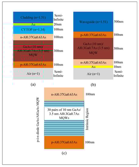 When 0 volts are applied to this diode, the modulator is on. Thus, the diode is off and has no special function to absorb the incident light in the PhCs layer. When a 1-volt reverse bias (or reverse bias larger than 1 volt) is applied to this diode, the modulator is off. Thus, the light is absorbed by the electronic section of the device and not transmitted to the PhCs output waveguide. The light waves are routed through the stack waveguide in the p-i-n, which causes increased damping in the “off” state of this ERMs. This is in accordance with the QCSE in MQWs of the intrinsic region. The structure of these MQWs consists of 30 pairs of 10 nm coupled layers of GaAs and 3.5 nm AlGaAs (Figure 3a).