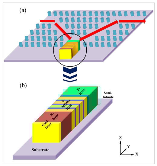 The electronic section of the ERMs is structured as a p-i-n diode with an intrinsic region of MQWs. There are two methods for using the gold layer in this structure, as shown in Figure 3. In the first design, the gold layer is located at the interface between the optical and electronic sections of the device. In this case, the wave hitting the gold surface is considered for using hybrid plasmonic MQWs modes in the “off” state of the modulator (Figure 3a), and TM polarization is used for the incident light []. In the second design, the gold layer is located at the bottom of the p-i-n diode for better reflectance, and the optimized thickness of the gold layer is 50 nm. In this case, TE polarization is propagated []. Because TE polarization is used in the PhCs, the second design is used and investigated here.