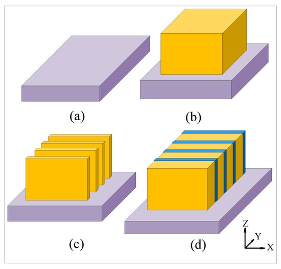 The proposed schematic of the coupled MQWs fabrication process is shown in Figure 5. In the first step, a substrate is provided for the growth of the designed layers. The substrate is common to the electronic and optical sections of the modulator, on which the PhCs are also implemented (Figure 5a). Next, a GaAs layer is grown to size in the intrinsic region of the p-i-n diode for deposition and patterning of the coupled MQWs (Figure 5b). The GaAs MQWs are then formed and developed through a mask and pattern process in the previous step to maintain the GaAs MQWs and vacant MQWs. The vacant MQWs are created through an etching process (Figure 5c). Finally, AlGaAs layers are deposited in the vacant MQWs (Figure 5d). Thus, an intrinsic region is created for the p-i-n diode via the coupled MQWs.