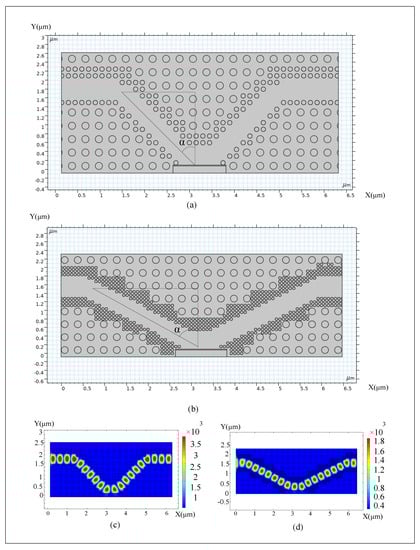 (a,b) The optical sections of ERMs based on hybrid PhC structures are shown with deflection angles of 45 and 60 degrees. (c) The electric field propagation plot for TE polarization in the PhC waveguide section corresponding to part (a). (d) The electric field propagation plot for TE polarization in the PhC waveguide section corresponding to part (b).