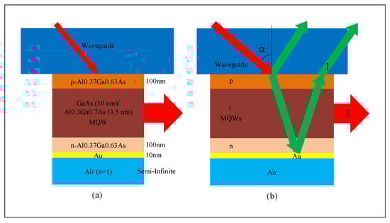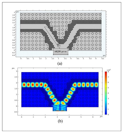 Depending on the alpha angle and the voltage applied to the diode (either zero or two volts), which is indicated by a green arrow, the light is reflected and exits the electronic section and is then coupled into the output path of the PhC waveguide (Figure 7b). Otherwise, as shown by a red arrow in the intrinsic region, the wave is propagated through the intrinsic region of the p-i-n diode, which consists of coupled MQWs and does not reach the output of the PhCs waveguide (Figure 7b).