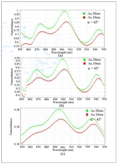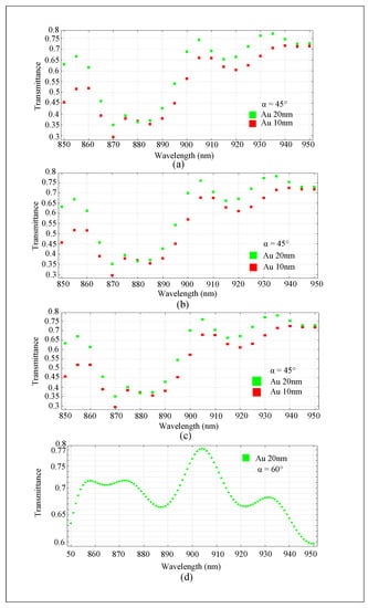 In all plots, green curves correspond to a transmittance rate with a reflective gold thickness of 20 nm, and red curves correspond to the transmittance rate through a reflective gold layer with a thickness of 10 nm (Figure 8 and Figure 9).