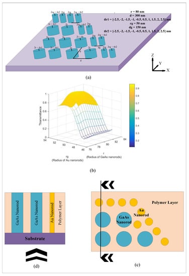(a) Design and schematic of the proposed structure with radius random tolerance of Au and GaAs nanorods performed simultaneously. (b) The transmittance in terms of the average radius of GaAs and Au nanorods is depicted simultaneously. (c) A part of the proposed structure consisting of polymer layer and GaAs and Au nanorods. (d) Schematic of the polymer layer and GaAs and Au nanorods placed together vertically.