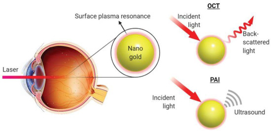 This review focuses on the potential applications of gold nanoparticles in ophthalmic imaging modalities. Gold nanoparticles (AuNPs) exhibit optical properties that can be advantageous for ocular imaging with optical coherence tomography (OCT) and photoacoustic imaging (PAI). OCT is a non-invasive imaging modality that detects the backscattering of light from biological tissues and allows the cross-sectional visualization of the retinal layers [4]. PAI of biological tissues is a hybrid technology based on the detection of acoustic waves generated from the absorption of optical energy and appears to be promising for ophthalmic imaging [5]. The introduction of a contrast agent such as AuNPs in the above imaging modalities can promote molecular imaging in ophthalmology and allow the diagnosis of ocular diseases at an early stage, before vision loss takes place. Gold nanoparticles also exhibit anti-angiogenic properties and could be useful for the management of ocular diseases, characterized by neovascularization [6]. Therefore, gold nanoparticles are attractive candidates to be used as “theranostics” in ophthalmology, which describes their ability to improve both ophthalmic imaging as well as the management of neovascular conditions in the eye.