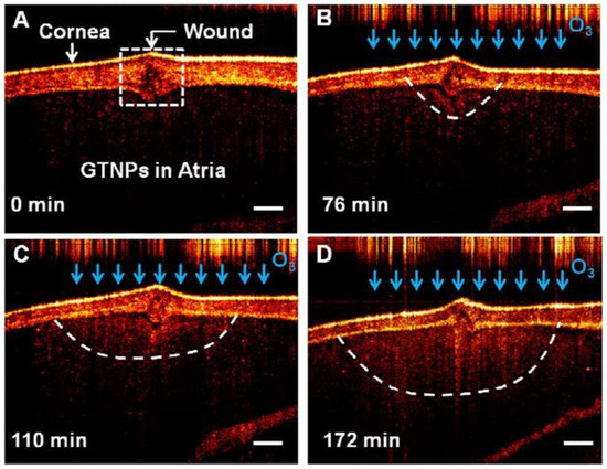 Ozone (O3) has oxidizing effects and can be harmful when penetrating the damaged corneal epithelium of the eye [87]. To visualize the penetration of O3 into the anterior chamber of the eye, Jiang et al. [88] used Au triangular nanoprisms as CAs for 3D OCT imaging, using an isolated crucian carp eye. The idea to use AuTNPs as CAs arose from the blue shift of the plasmon peak due to morphological changes in the presence of O3 [89]. After the Au nanoparticle injection (~0.0228 mg/mL) in the anterior chamber of the eye, contrast enhancement was noticed in OCT imaging. The crucian carp eye with a damaged cornea was exposed to O3 to study its distribution and OCT images were obtained at several time points. It was noted that the area around the wound had enhanced contrast due to the NPs’ morphological change (Figure 3). These results indicated that Au nanoprisms could serve as a promising CA for the detection of O3 in the eye using OCT imaging.