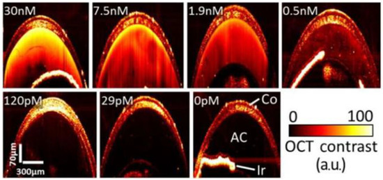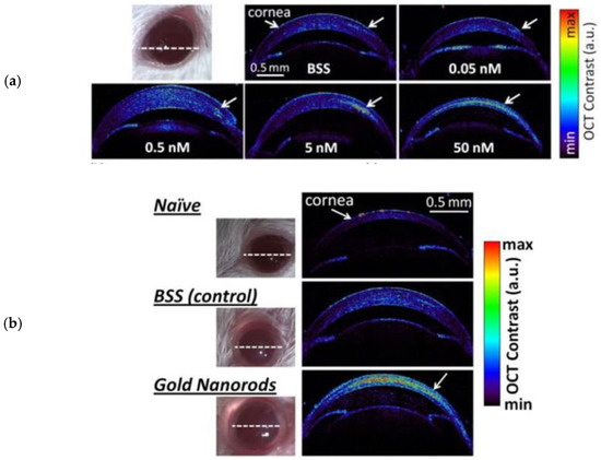 De la Zerda et al. [90] investigated the use of gold nanorods (GNRs) as optical coherence contrast agents in vivo, in mice eyes. Corneal and anterior chamber injections of two different sizes of GNRs were performed: GNRs corresponding to a peak absorbance wavelength of 780 nm (GNR-780) and 850 (GNR-850). When GNR-850 was injected into the anterior chamber at various concentrations, it was seen that concentrations of 120 pM or above resulted in a significantly different OCT contrast (Figure 4). Moreover, the signal from corneas injected with GNR-780 was three times stronger compared to mice corneas injected with balanced saline solution (BSS) and 7.5 times stronger compared to naïve mice corneas (Figure 5). Overall, this study led to the conclusion that GNRs can be characterized as high-sensitivity CAs for OCT in living animals and are capable of creating an OCT signal stronger than the background signal of ocular tissues.