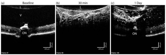 Sandrian et al. [92] performed intravitreal injections of Au nanorods (aspect ratio: ~3.4) to determine their eligibility as CAs for OCT, as well as their potential ocular inflammatory effects on the eyes of mice. Images were taken before and approximately 30 min and 24 h after the injection. Unconjugated PSS–AuNRs (Au nanorods coated with poly(strenesulfate)) and Ab–AuNRs (Au nanorods coated with anti-CD90.2 antibodies) were chosen for the injections. As seen in Figure 6 and Figure 7, an enhanced backscattered signal was noted in the vitreous of the AuNR-injected mice, when compared to baseline images and images obtained from mice that received PBS injection. A day after the GNR injection, the increased contrast could still be observed. These results indicate that AuNRs can function as CAs and be imaged within the vitreous. Nevertheless, the intravitreal injection of bare GNRs resulted in the creation of opacities of unknown nature and were attributed to the immunological response to the GNR injection.