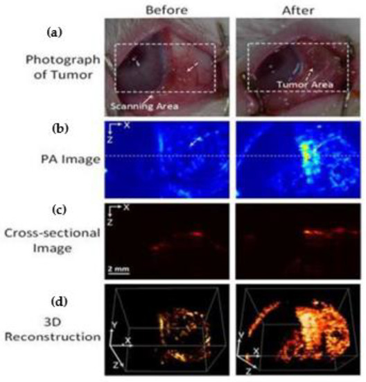 Kim et al. [104] investigated the potential of AuNPs to work as both a therapeutic and diagnostic means for intraocular tumors. AuNPs coated with fucoidan (Fu) and conjugated with doxorubicin (Dox), a chemotherapeutic drug, were able to act as anti-tumor agents due to their chemo-photothermal properties in vitro and in vivo. Using rabbit models with VX2 tumors, the feasibility of Dox-Fu@AuNPs to function as CA for photoacoustic imaging was tested. Imaging before and after the intratumoral injection of 100 µL of Dox-Fu@AuNPs (200 µg/µL) was performed in vivo. The tumor that had received the injection produced stronger PA signals compared to images before the injection. Moreover, the post-injection image allowed the visualization of more than two-fold deeper tissue (p < 0.001), and the tumor margins were clearly viewed (Figure 8). This study proved that AuNPs can be useful as tools for both the treatment and imaging of intraocular tumors, as they increase the PA contrast and aid in determining the tumor margins.