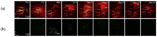 Longitudinal in vivo PAM images at different wavelengths: (a) 578 nm and (b) 650 nm before then GNS injection and 2 h, 48 h, 72 h, 5 d, 7 d, 9 d, 11 d and 14 d after the GNS injection (0.4 mL, 5 mg/mL). White arrows show choroidal vessels (CVs) and white dotted arrows show choroidal neovascularization (CNV) [109].