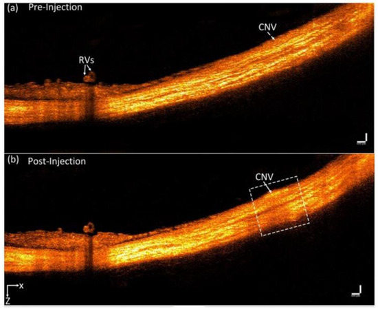 OCT image enhanced with GNS in vivo: B-scan OCT images obtained before (a) and 2 h after IV injection of GNS (b). The white arrows indicate the position of choroidal neovascularization (CNV) [109].