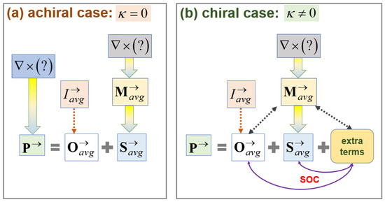 Figure 1a illustrates that an achiral medium gives rise to an orderly hierarchy, whereas Figure 1b depicts that a nonzero medium chirality renders key bilinear parameters interrelated among them. The presented key bilinear parameters include the energy density , the Poynting vector , the linear momenta (orbital and spin portions), and the spin angular momentum density . These parameters are time-averaged ones for time-oscillatory fields in an unbounded space. In Figure 1b for a chiral medium, extra terms characterize spin–orbit couplings (SOCs), whereas there is a clear separation between in Figure 1a for an achiral medium due to the absence of a SOC.