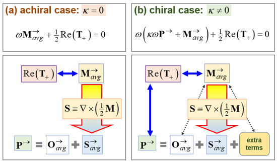 Here, we have made use of the Maxwell equations in Equation (3) along with the vector identities in Equation (7). See Appendix A for the derivation of Equation (14). From a physical point of view, signifies the conservation of , for which we could find its potential according to the last vector identity in Equation (7). The self-cancelling feature between has been fully discussed with a proper example, with the EM fields induced by electric point dipoles [12]. Notice hence that Equation (14) holds true not only to an achiral case but also to a chiral case. This fact means that we need to examine separately for a chiral case.