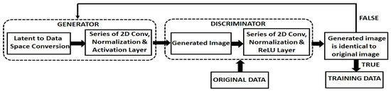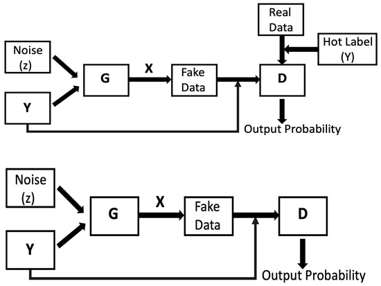 The discriminator’s training flow is presented in Figure 4. In this Figure, G is the generator, D represents the discriminator, X indicates the fake images conditioned on Y, Y is the hot label for real data images and Y is the hot label for fake images. Random noise was fed to the generator along with class encoded hot label Y to foster fake images conditioned upon Y. In this cycle, gradients were not passed down the generator. The generator training process was similar to the discriminator training cycle, as illustrated in Figure 4. Both the discriminator and the generator were proficient enough to foster data close to the original data. During this training phase, discriminator gradients were conceded by the generator.