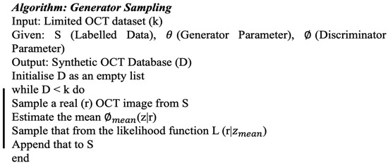 The generator created accurate new instances using the algorithm presented in Figure 3. The discriminator’s task was to differentiate between the real and real-like created instances, as illustrated in Figure 2. If the cGANs-produced image was identical to the original image, then it was appended to the labelled class of images.