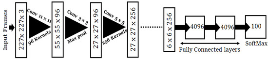 Figure 5 represents the cutting edge CNN algorithm (AlexNet), in which each chunk signifies the input and output characteristics [38]. AlexNet architecture consists of eight layers with five convolutional and three fully-connected layers. AlexNet was preferred to validate of our synthetically created images due to its competitive edge in training the cGANs. Dropout was functional on the first and second fully-connected layers. The input image dimensions were 227 × 227 × 3. For down-sampling, a max-pooling operation was implemented for a stride of two between the adjacent frames. In the dropout phase, a neuron with a probability of ½ was disregarded. This means that the neuron had not contributed to the forward propagation or the back propagation loss. This ensured that every iteration captured a diverse sample of the model’s parameters without being over fitted.