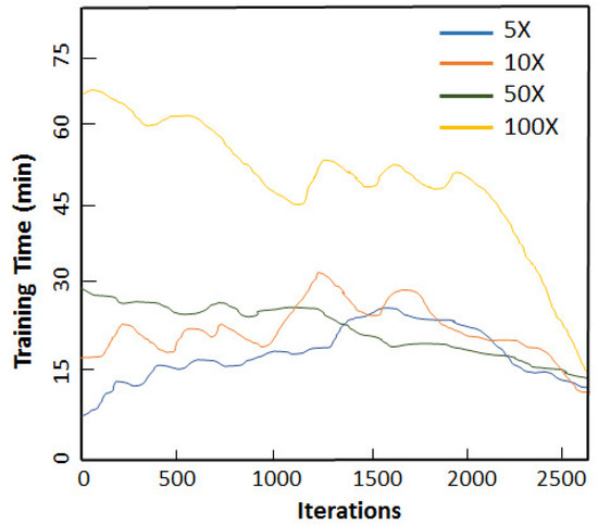 The relationship between the iterations and training time is exhibited in Figure 7 for different augmentation scaling. We performed experiments for 5×, 10×, 50× and 100× and recorded the training time in minutes for each set of experiments. These multiplicative factors were chosen for simplicity and by observing the diversity and imbalance present in our original dataset. To observe the pronounced effect of augmentation, we scaled for 50× and 100×. This helped determine the extent to which data could be augmented and enhanced our classification accuracy. It can be inferred from Figure 7 that 5× was the optimum augmentation scheme for our created dataset. This is attributed to fact that our original OCT dataset was limited in size; therefore, 5× and 10× did not significantly improvise in terms of the samples’ diversification. Similarly, 100× led to overfitting our sample space along with adding an additional computational burden. An interesting point that can be deduced from the results presented in Figure 7 is that the increase in the training data was not exactly proportional to the increase in the performance. When a specific threshold was achieved, no further improvement in the performance was observed. This is attributed to the fact that the diversity of data could not be further improved.