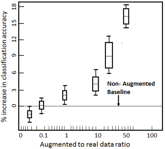 We further envisaged the effect of the augmented-to-real ratio on the increase in the classifier’s performance, as illustrated in Figure 8. The dotted line indicates the non-augmented baseline. As we increased the augmented-to-real ratio, the dataset inflated in terms of size and diversity, allowing the classifier to train more rigorously. This diversification of samples ameliorated the classifier’s ability to more correctly ascertain the labels. The classifier’s accuracy increased until our augmented-to-real ratio reached 50, as indicated in Figure 8. It then flattened due to similar and repeated samples being created. This filled the dataset, but could not further boost the generality of the model. The overall increase in the classifier’s performance due to augmented data was 15.8%. In Figure 8, the height of the bar indicates variance and the outer stubbles mark the maximums and minimums.