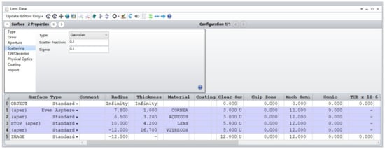 - The scattering types of the cornea and crystalline lens were set as Gaussian distributions with the parameters of the scatter fraction and a sigma [18].