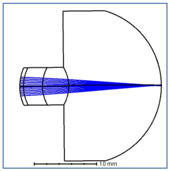 - The Gullstrand–Legrand eye model [14,15], which was selected as the basis, comprises six spherical surfaces and is suitable for predicting the optical quality near the axis of the eye.
