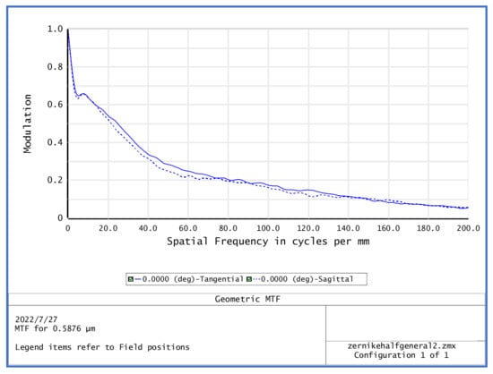 Figure 3 shows a schematic of the designed scatter eye model, and Figure 4 shows a polychromatic MTF for the 0-degree field evaluated at a 3.0 mm entrance pupil with the third scatter factor in Table 3. The MTF of the individual eye model can be calculated well, which is shown in Figure 4.