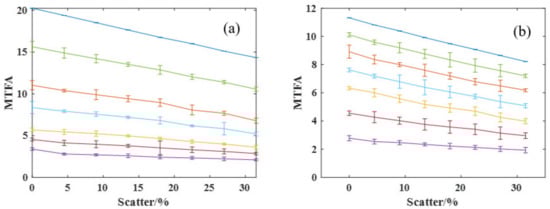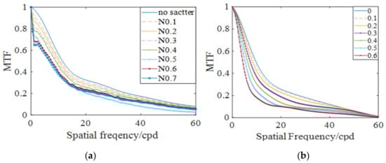 Impact of scatter on MTFA (area under modulation transfer function). (a) monochromatic light; (b) white light.