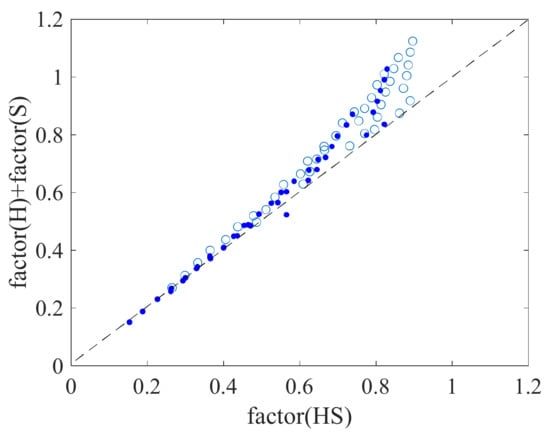 Here MTFA(HS) and MTFA(0) denote the MTFA values of the eye with specified scatter and HOAs and without scatter and HOAs, respectively. HS denotes the HOAs and scatter in the human eye. The impact factors were calculated for eyes with seven types of scatter and six types of HOAs. In this study, the investigation of the relationship between Factor(HS) and the sum of Factor(H) and Factor(S) was important.