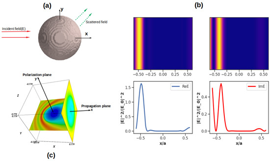 Shape of an aerosol dust particle (a) used to test for the impacts of the size, surface roughness, ambient medium, and the imaginary part of the complex refractive index. The real and imaginary parts of the plain-polarized incident electric field vector pass through the center of the particle (b), with being the particle diameter and the intensity, and (c) is the 3D diagram of the plain-polarized incident electric field showing the polarization and propagation plains. (a,c) were generated using the Mayavi2 open-source software.