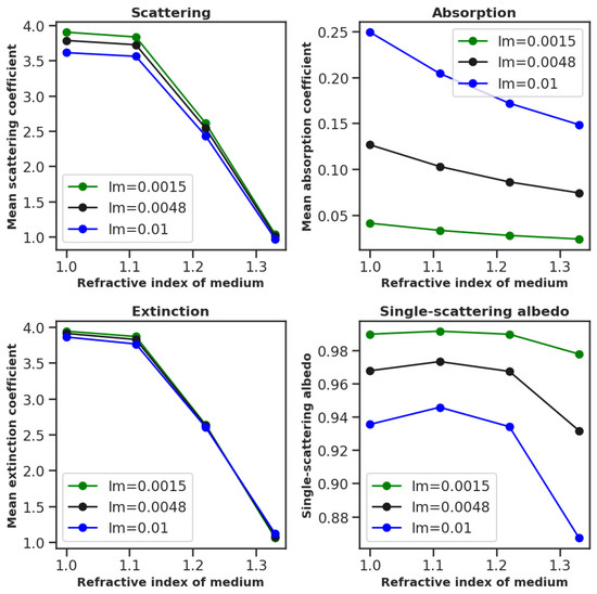 The relation between the mean scattering, absorption, extinction coefficients (efficiencies), single-scattering albedo, and the refractive index of the ambient medium. Graphs are plotted for different values of the complex refractive index of the dust aerosol. All of the coefficients are shown to decline with an increase in the refractive index of the ambient medium, but the increase in the imaginary part of the complex refractive index increases the light absorption by the particle.