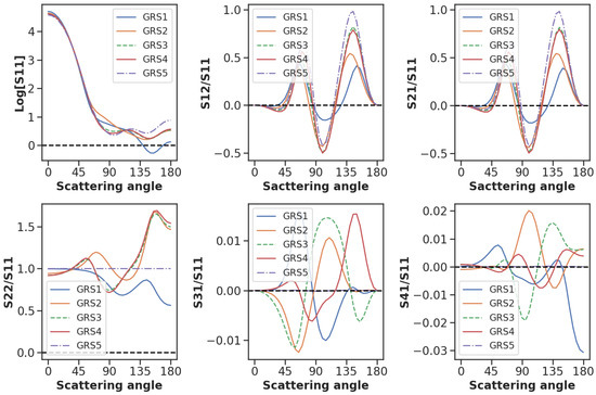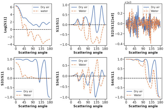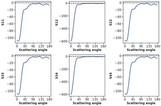Most scattering problems will require the computation of the scattering matrix , which describes the angular distribution of the intensity and polarization of the scattered radiation. The incident and scattered radiation of the Stoke vector are linked through the scattering matrix [6,37,38], where I denotes the intensity and Q, U, and V the polarization states. The relationship between the incident and scattered radiation is therefore given by [6]
