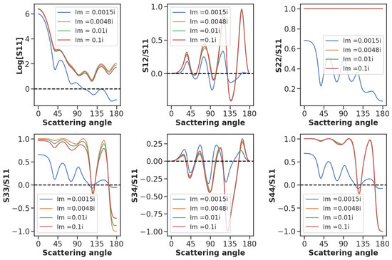 Comparing the six relative Mueller matrix elements plotted against the scattering angle for aerosol particles in the air and in water, for the complex refractive index of the dust aerosol, the simulated results presented in Figure 3 show that the intensity of the scattered field reduces for particles in water compared to air. This can also be seen in Table 1, where all of the coefficients and albedo decrease from dry air to water. The polarization states also depend on the refractive index of the ambient medium. The optical properties are simulated by considering an incident wavelength of m and assuming a spherically shaped aerosol particle. In Figure 4, the scattering properties of the dust aerosol particle in water relative to air are presented. This figure gives negative scattering matrices, signifying the scattering efficiency in the air is higher than in water. This figure equally exposes a strong symmetry between the diagonal Mueller matrix elements and between the off-diagonal elements for homogeneous and isotropic particles. From Figure 5 and Table 1, the imaginary part of the complex refractive index of the dust aerosol has been increased from to . Here, we see that the scattering intensities, scattering cross-sections, and albedo decrease with an increase in the imaginary part of the complex refractive index, signifying the importance of accurately estimating the imaginary part of the complex refractive index of aerosols for aerosol theoretical and experimental studies.