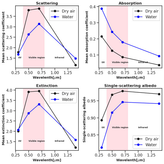 The relation between the mean scattering, absorption, extinction coefficients (efficiencies), single-scattering albedo, and wavelength of the incident light. A spherically shaped particle with a complex refractive index and size parameter at m was used. Graphs are plotted for different values of the wavelength that ranges from the infrared to the ultraviolet region in both dry air and water. The middle region in pink is the visible region. Visible light has higher scattering and absorption efficiencies and SSA in both dry air and water compared to UV and infrared.