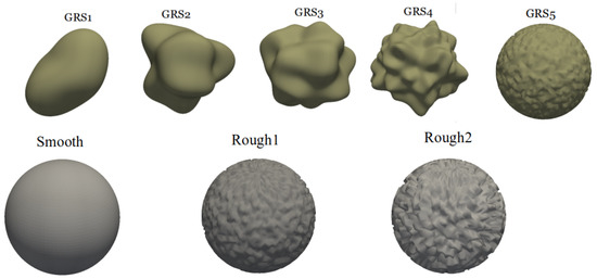To model the impacts of the ambient medium, size, surface roughness, and the imaginary part of the particle complex refractive index, the shape of the particle is fixed and assumed spherical. The medium refractive index is varied from dry air to water (1–1.33); the particle’s dimensionless size parameter , where is the particle’s effective radius, is varied from 5 to 17.6; a surface roughness length is induced in the particle; and the imaginary part of the complex refractive index of the particle () varies between 0.0015 and 0.1. The choice of m has been published by Biagio et al. [26]. To investigate the impact of the incident wavelength, different light sources are used as incident light with a wavelength ranging from UV (0.3 m) to infrared (1.4 m) for the same spherical particle shape and complex refractive index. The particle shape impact is investigated by simulating five different Gaussian random spheres (GRS1, GRS2, GRS3, GRS4, and GRS5) using the SIRIS version 4 software. The shape file is then converted to a DDSCAT shape file using the nanoHUB online tool found at https://nanohub.org/login?return=L3Rvb2xzL2RkYWNvbnZlcnQvc2Vzc2lvbj9zZXNzPTIwMjk0ODM= (accessed on 20 April 2023). Since the particles are irregular and asymmetric, the orientation of the particle in space relative to the incident plane is a major factor that can affect aerosols scattering computation. For randomly oriented, irregular, asymmetric particles, we apply the method of orientational averaging since we cannot tell the orientation of the particle in space at a particular time. Three angles, , , and , are used to describe the angular orientation of the particle in space. In this work, for efficient computation, we have set and to run from with intervals, which make use of the mid-point averaging rule, and varies in the interval with intervals, which make use of the Simpson’s rule since N is odd. We average the calculations over 48 angular orientations of the target and 2 incident polarizations.