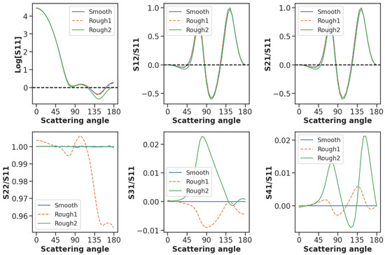 Surface roughness has been assumed to have a considerable impact on the light-scattering properties of aerosol but has not yet been experimentally investigated. In this section, we model the impact of surface roughness on aerosol optical properties by considering a spherical particle shape with different degrees of surface roughness as shown in the bottom row of Figure 7. Figure 9 shows that a small amount of induced surface roughness can significantly affect the degree of linear polarization of the particle but has a negligible effect on the scattering intensity. From Table 1, we see that all coefficients show no significant change when compared to the smooth particle, but there is a slight decrease in the intensity of the back-scattering as the roughness length increases. Figure 9 and the scattering results in Table 1, together with the results presented in Figure 8, show the impact of surface roughness is not as significant as the general particle structure but can affect the polarizability of the particle.