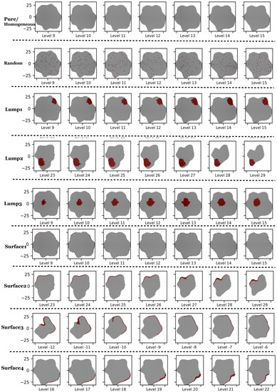 Tomography images when the particle in Figure 11b is sliced along the z-axis in the x-y plane to show the location of the pure dipole particles (grey) and impurities (dark red). All models (surface and internal incursion) used in this study are shown above. While the particle shape is the same for all impurities, only the z-levels with the highest inclusion content are shown. Complete tomographic images can be found in Supplementary Figures S1–S9, respectively.